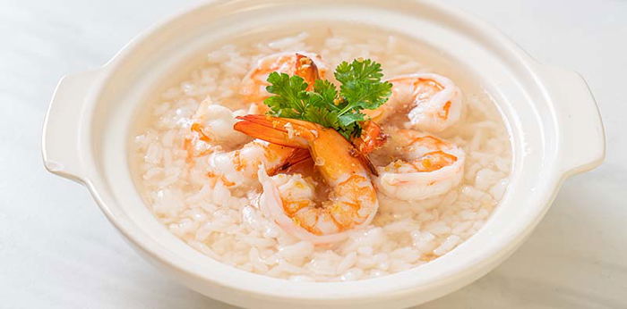 - แบ่งน้ำซุปใส่หม้อเล็ก ตักข้าวใส่ถ้วยเตรียมไว้ พอน้ำซุปเดือด ก็ใส่กุ้งลงไปต้มจนสุกแล้วตักใส่ชามข้าว โรยด้วยผักต่าง ๆ กระเทียมเจียวและพริกไทย