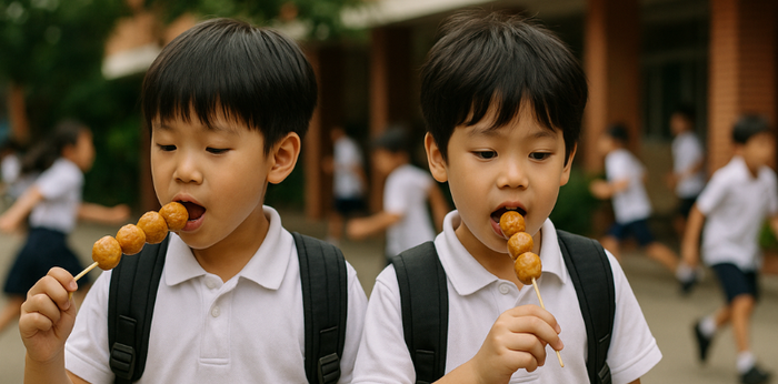 ทีนี้จังหวะลูกๆเดินมาแล้วและกำลังรอให้ลูกไปเข้าห้องน้ำ ได้มีเด็ก นร.ชาย ป.2 (ที่รู้ว่าป.2 เพราะว่าวันนั้นใส่ชุดลูกเสือ มีปักชั้นที่แขน) น้องเดินกินลูกชิ้นมา ซึ่งเราก็ระแวงว่าไม้ลูกชิ้นจะแหลมมั้ย(กลัวทิ่มคอเวลาเดินกิน) แต่ดูแล้วไม่แหลมแต่ก็ดูน่ากังวลกับความปลอดภัย