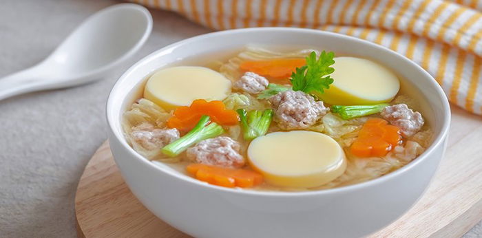 วัตถุดิบ เต้าหู้ไข่ทรงเครื่อง : เต้าหู้ไข่ 2-3 หลอด แป้งข้าวโพด กระเทียมสับ 1 ช้อนโต๊ะ หมูสับ 50 กรัม เห็ดหอมแช่น้ำจนนิ่ม 5-6 ดอก แครอทหั่นเต๋า 1/2 ถ้วย ข้าวโพดอ่อนซอย 1/2 ถ้วย น้ำมันหอย 2 ช้อนโต๊ะ ซีอิ๊วขาว 1 ช้อนโต๊ะ น้ำตาลทราย 2 ช้อนชา พริกไทยป่น 1 ช้อนชา น้ำซุป 1 ถ้วย แป้งข้าวโพดละลายน้ำ 3 ช้อนโต๊ะ และต้นหอมซอย