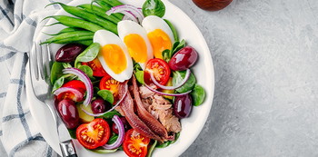 - ลวกถั่วแขกให้พอสุก แล้วแช่ในน้ำเย็น จากนั้นนำมาใส่รวมกับผักสลัดและทูน่า ราดน้ำสลัดที่เตรียมไว้