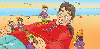 Gulliver slept for a whole day. When he woke up, the Sun was beating down upon him. He tried to move, he could not. His hair, hands, legs and body were tied to the ground.