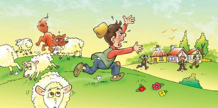 “ช่วยด้วย ๆ ฝูงหมาป่ากำลังจะมากินฝูงแกะของผม” เมื่อชาวบ้านได้ยินสิ่งที่เด็กชายพูด ทุกคนต่างพากันหยิบจับอาวุธ หรือข้าวของใกล้ตัวเพื่อพากันไปไล่หมาป่า ก่อนที่หมาป่าจะกินแกะของเด็กชายจนหมดฝูง
