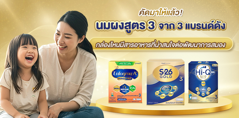 theAsianparent คัดสรร นมผงเด็กสูตร 3 ที่เหมาะกับลูกวัย 1 ขวบขึ้นไป ทั้ง 3 แบรนด์ดัง ได้แก่ S-26 GOLD 3, Enfagrow A+ MindPro 3 และ Hi-Q Plus Super Gold 3 มาเทียบสารอาหารกันแบบหมัดต่อหมัด กล่องไหนเด่นเรื่องอะไร และกล่องไหนจะเป็นคำตอบที่ใช่ ในการช่วยพัฒนาสมอง ให้ลูกพร้อมเรียนรู้สิ่งใหม่ๆ ได้อย่างเต็มศักยภาพ ตามมาดูไปพร้อมกันค่ะ