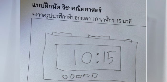 ปรากฏว่า เด็กได้ทำการบ้านวาดรูปนาฬิกามาจริง ๆ แต่เป็นนาฬิกาแบบดิจิทัล ที่หน้าปัดขึ้นเลขโชว์ 10:15 ดูจากโจทย์แล้ว น้องทำถูกต้องอย่างแน่นอน แต่ถ้าหากดูจากตัวอย่างที่แบบฝึกให้มาก็ใจหวั่น ๆ ทำไมมีแต่ภาพนาฬิกาแบบอะนาล็อกทั้งนั้นเลยล่ะคะ